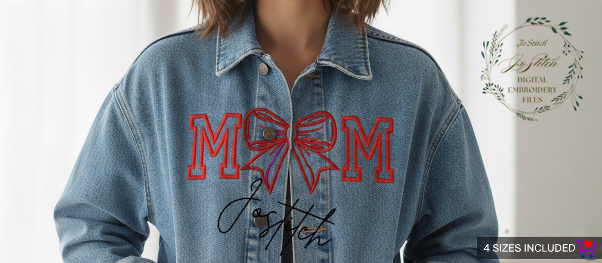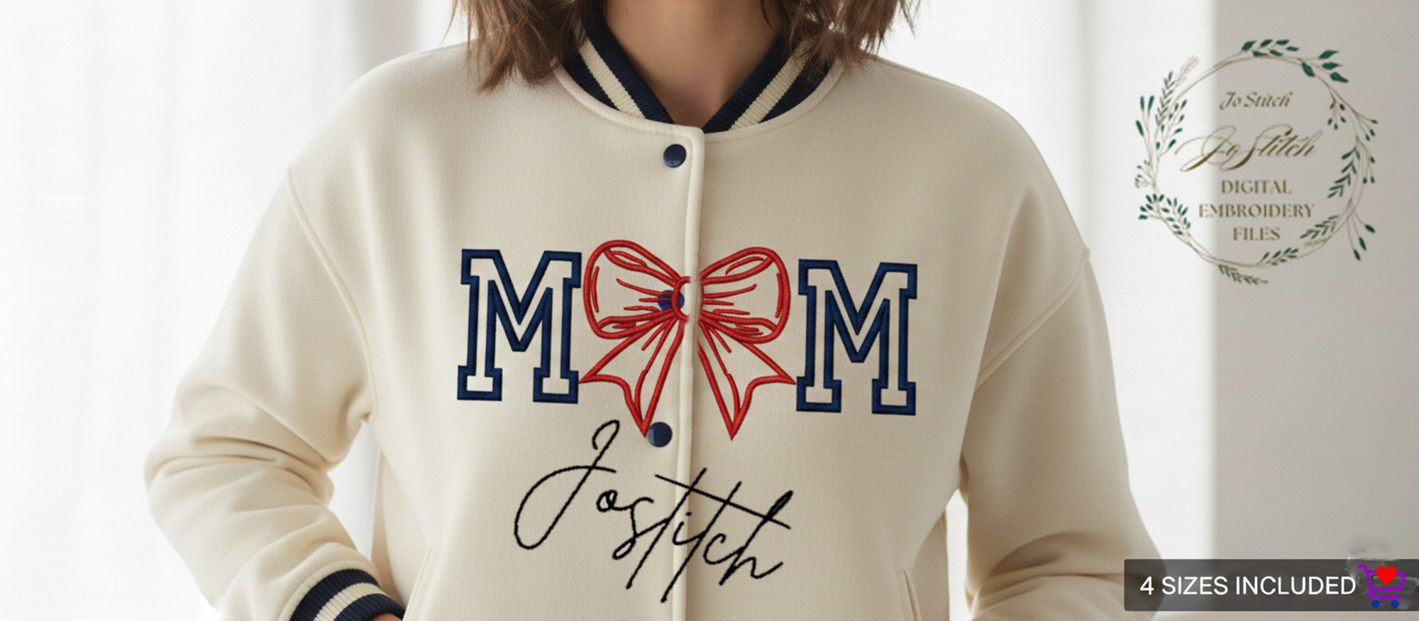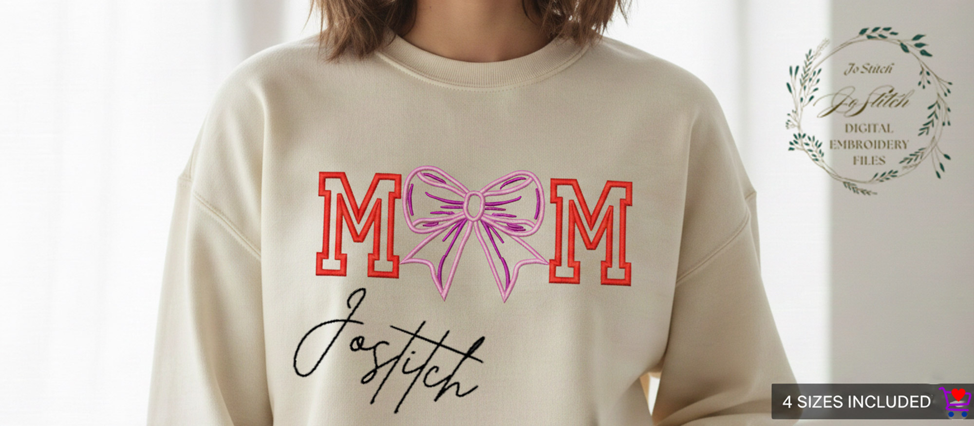 Coquette Mom Embroidery Design – Varsity Mama Pink Ribbon Bow | Mother’s Day Machine Embroidery File | PES, DST Digital Download
