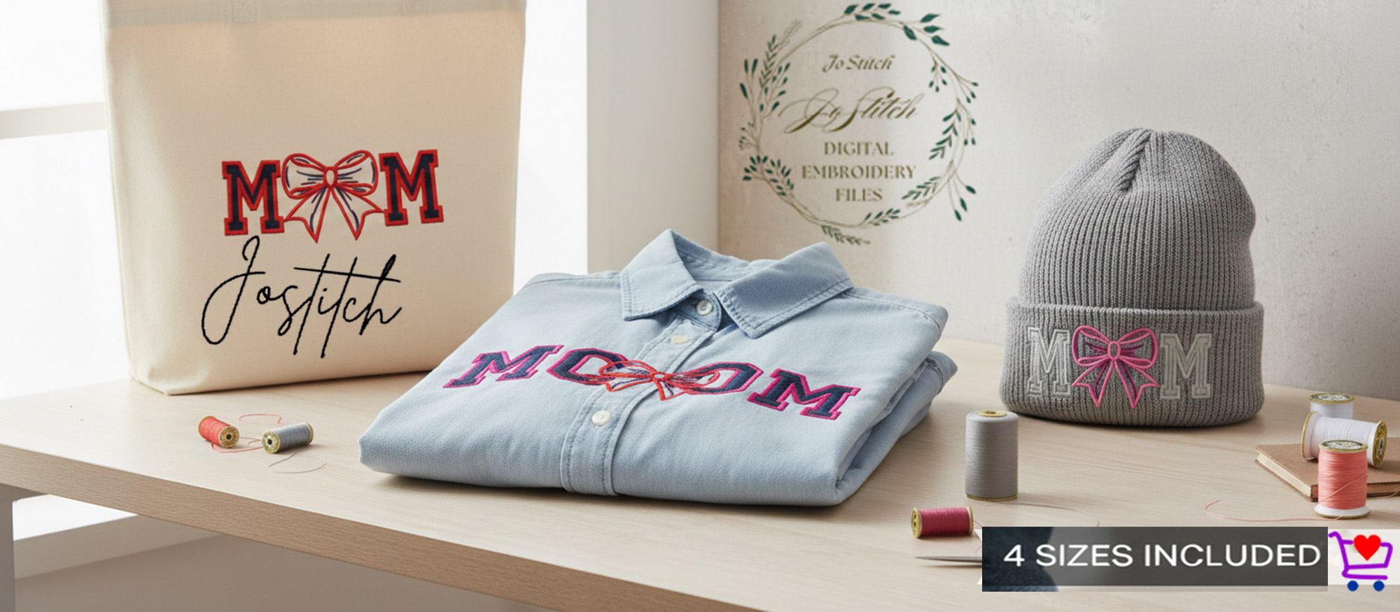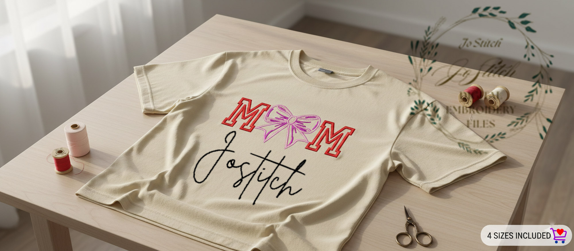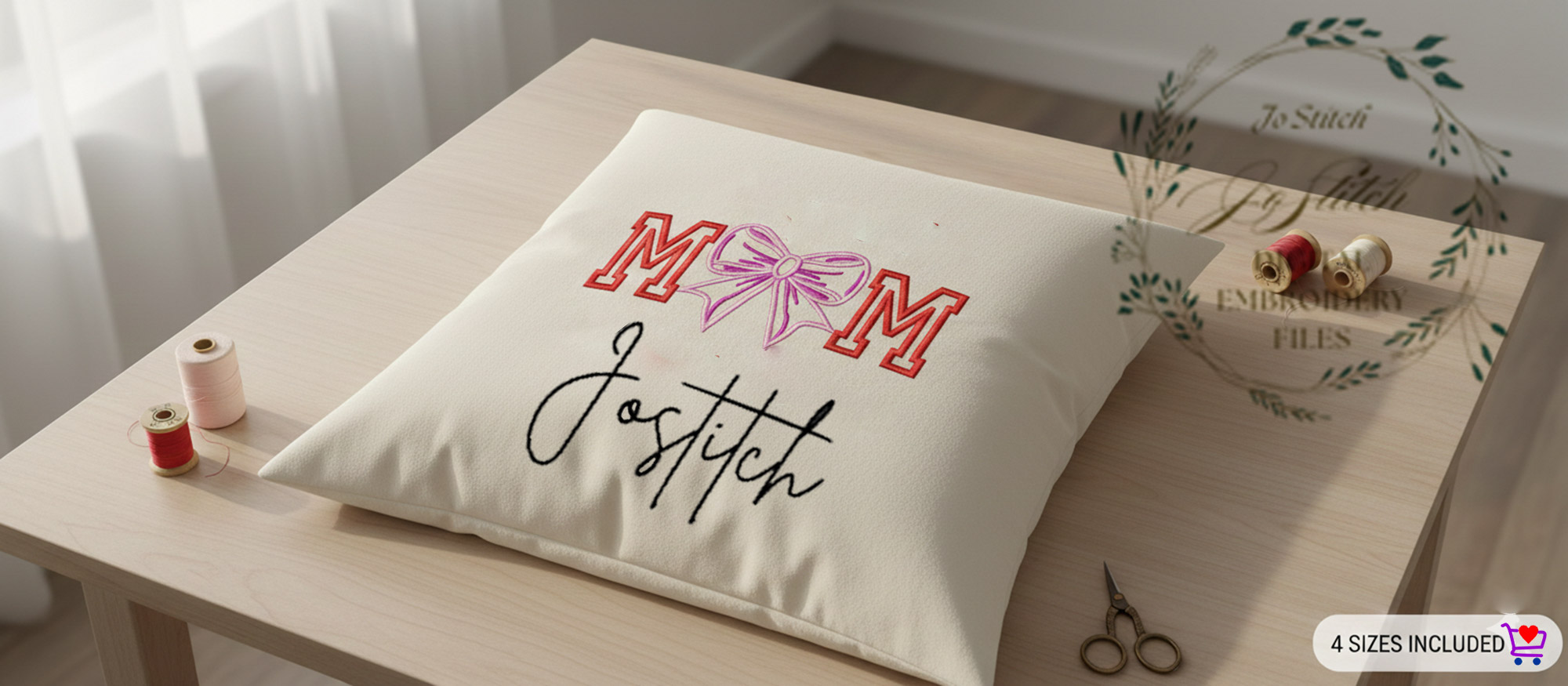 Coquette Mom Embroidery Design – Varsity Mama Pink Ribbon Bow | Mother’s Day Machine Embroidery File | PES, DST Digital Download